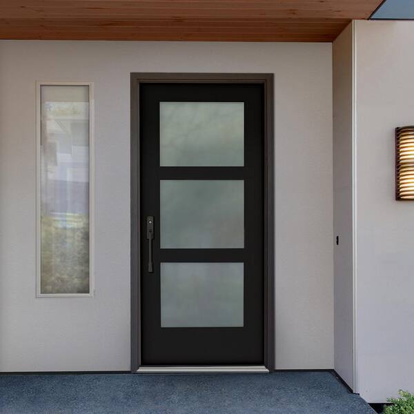36 in. x 80 in. Left-Hand/Inswing 3 Lite Satin Etch Glass Cypress Painted Fiberglass Prehung Front Door w/4-9/16" Frame
