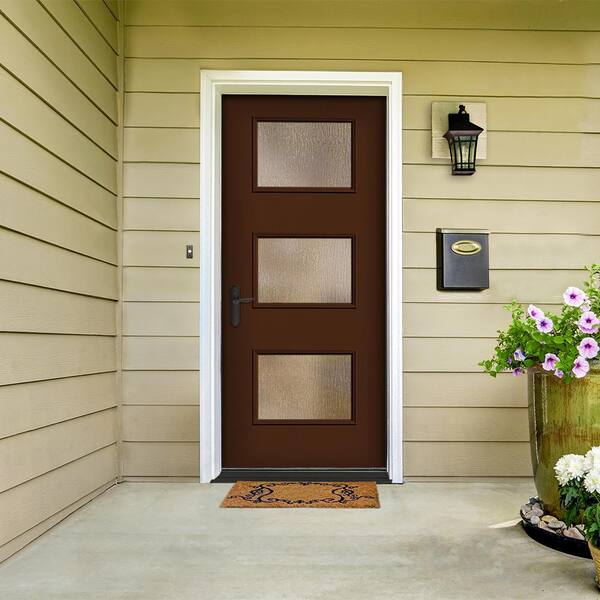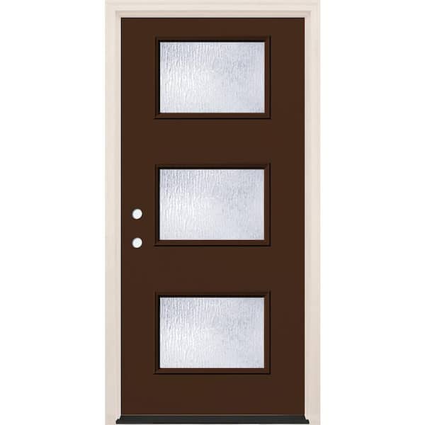 36 in. x 80 in. Right-Hand/Inswing 3-Lite Rain Glass Chestnut Painted Fiberglass Prehung Front Door w/4-9/16 in. Frame