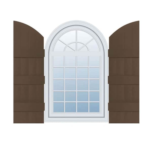 14 in. W x 77 in. H Vinyl Exterior Arch Top Joined Board and Batten Shutters Pair in Federal Brown