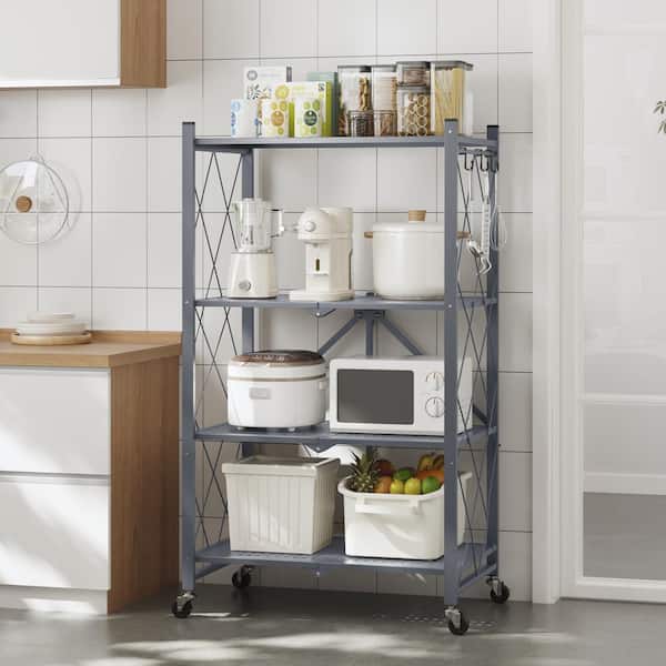 4-Tier Grey Foldable Metal Rack Storage Shelving Unit, Kitchen Shelf with Wheels