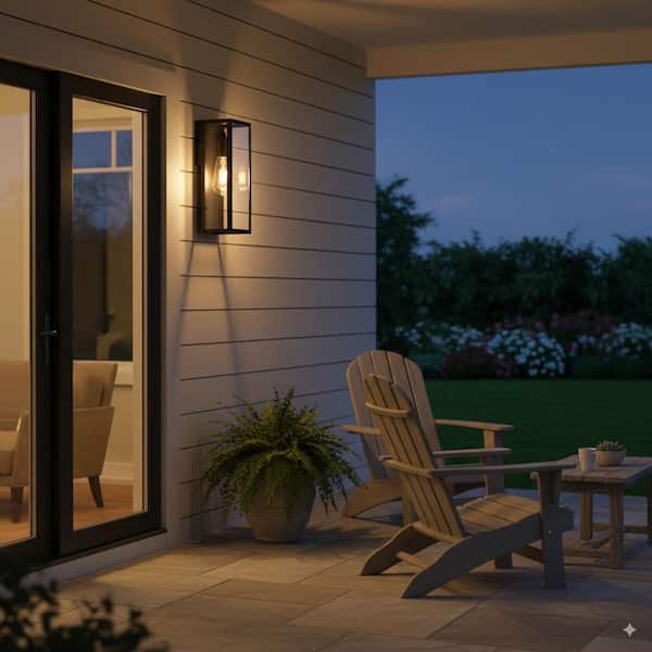 • Black outdoor wall lanterns with clear tempered glass shade.