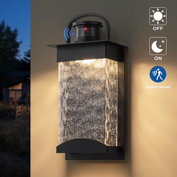 13 in. Black Motion Sensing Dusk to Dawn Outdoor Hardwired Wall Lantern Sconce with Bubbled Water Glass (1-Pack)