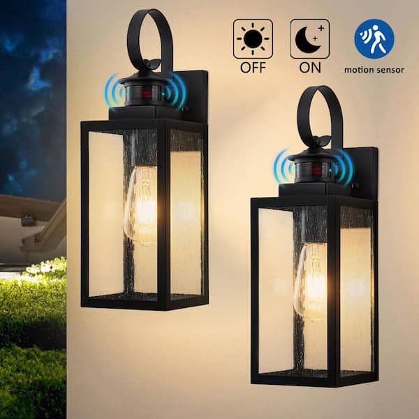 16. 75in Matte Black Motion Sensor Dusk to Dawn Outdoor Hardwired Wall Lantern Sconce, No Bulbs Included (2-Pack)