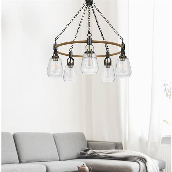 60W x 5 light Kavala Antique Brass Metal Chandelier with Burlap Accent and Glass Shades