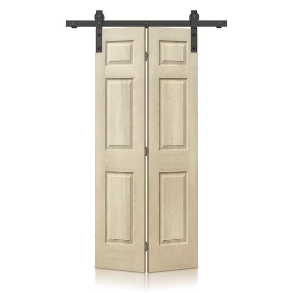 36 in. x 80 in. Vintage Cream Stain 6 Panel MDF Composite Hollow Core Bi-Fold Barn Door with Sliding Hardware Kit
