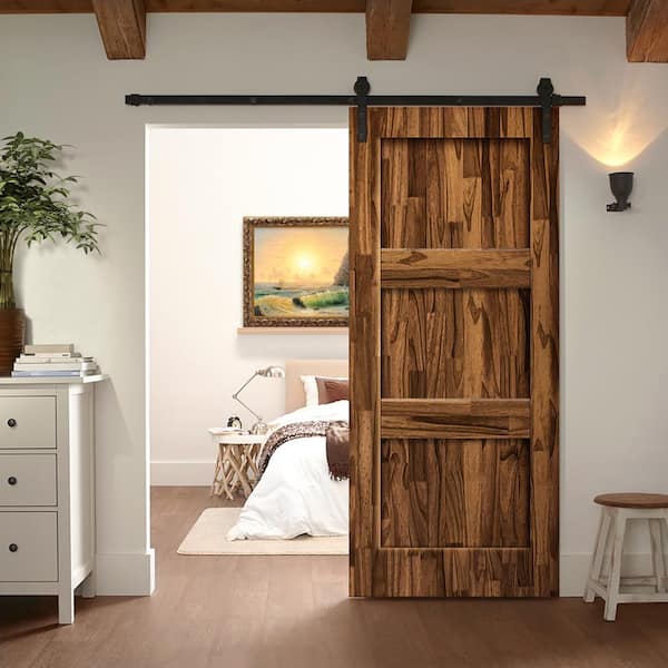 36 in. x 96 in. 3 Panel Shaker Hollow Core Walnut Stained Pine Wood Interior Sliding Barn Door with Hardware Kit