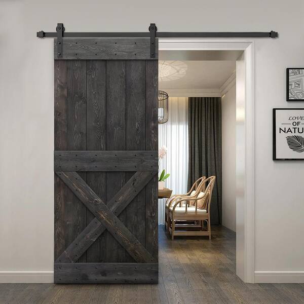 36 in.x84 in. Distressed Mini X Series Charcoal Black-Stained Solid Pine Wood Interior Sliding Barn Door w/ Hardware Kit