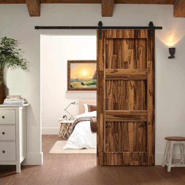 42 in. x 80 in. 3 Panel Shaker Hollow Core Walnut Stained Pine Wood Interior Sliding Barn Door with Hardware Kit