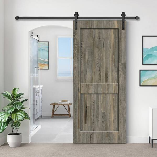 42 in. x 84 in. 2 Panel Shaker Hollow Core Weather Gray Stained Pine Wood Interior Sliding Barn Door with Hardware Kit