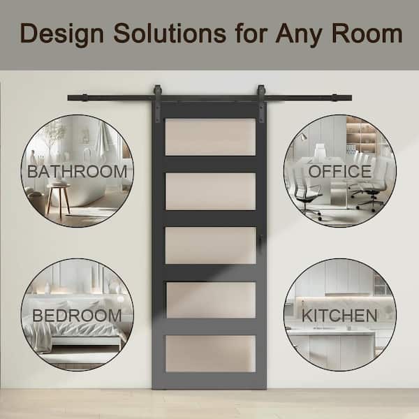 42 in. x 84 in. 5 Lite Tempered Frosted Glass Black Finished Composite Interior Sliding Barn Door with Hardware Kit