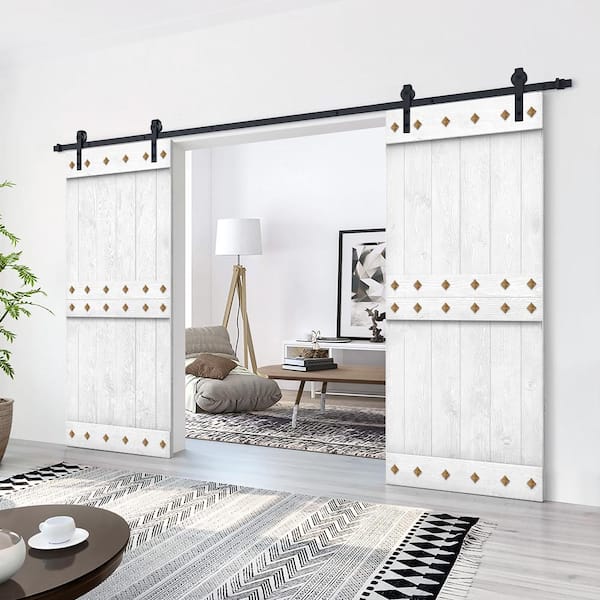 48 in. x 84 in. Light Cream Stained DIY Pine Wood Interior Double Sliding Barn Door with Hardware Kit and Clavos