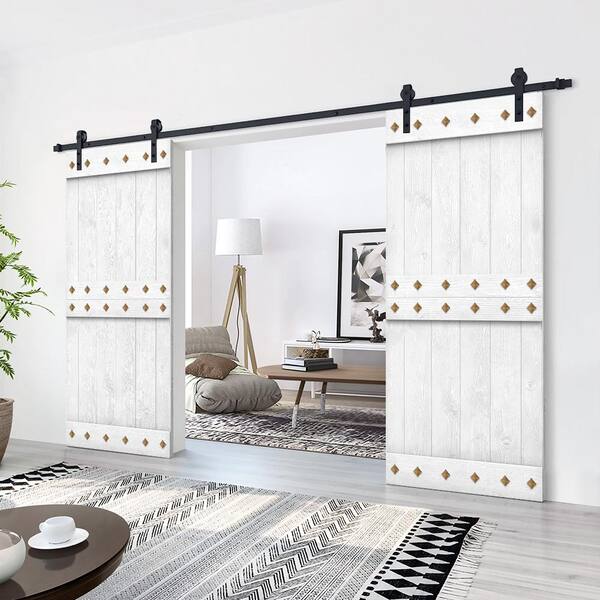 52 in. x 84 in. Light Cream Stained DIY Pine Wood Interior Double Sliding Barn Door with Hardware Kit and Clavos