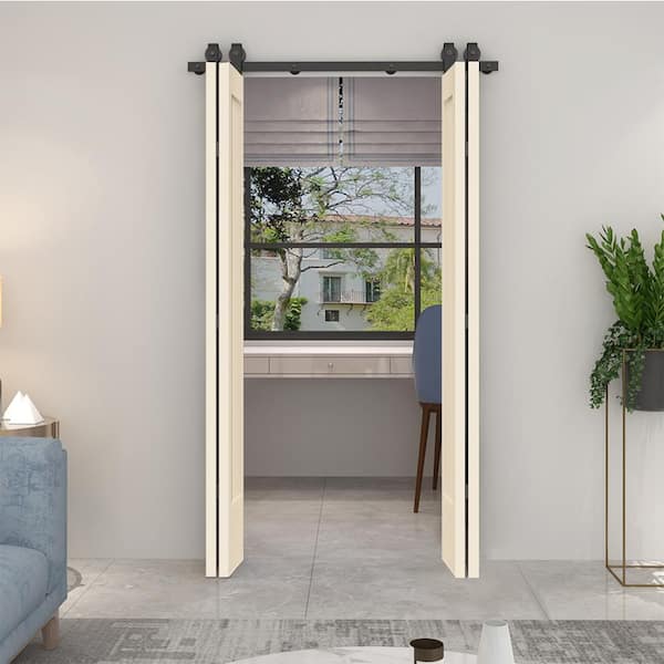 60 in. x 80 in. 1 Panel Shaker Beige Painted MDF Composite Double Bi-Fold Barn Door with Sliding Hardware Kit