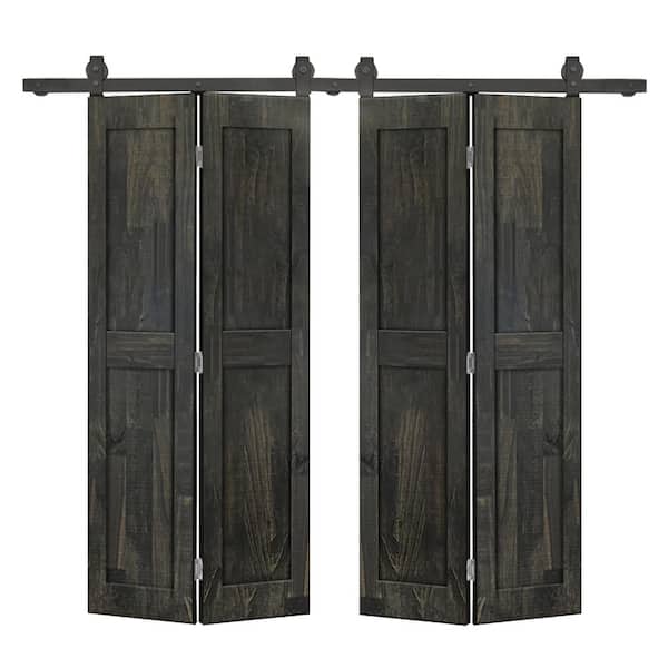 60 in. x 84 in. 2-Panel Shaker Hollow Core Charcoal Black Pine Wood Double Bi-Fold Door with Barn Door Hardware Kit