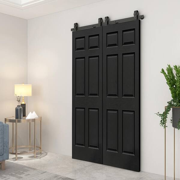 60 in. x 84 in. 6-Panel Black Painted MDF Hollow Core Composite Double Bi-Fold Barn Doors with Sliding Hardware Kit
