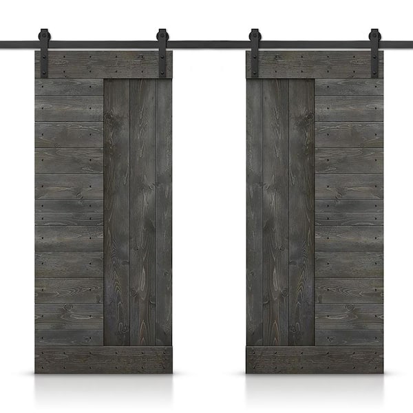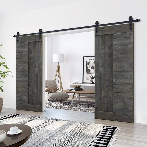 60 in. x 84 in. Carbon Gray Stained DIY Knotty Pine Wood Interior Double Sliding Barn Door with Hardware Kit