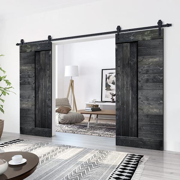 60 in. x 84 in. Metallic Gray Stained DIY Knotty Pine Wood Interior Double Sliding Barn Door with Hardware Kit