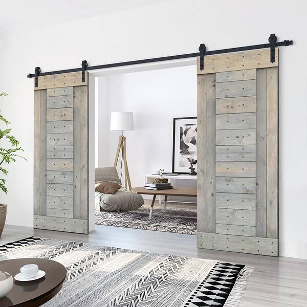 60 in. x 84 in. Smoke Gray Stained DIY Knotty Pine Wood Interior Double Sliding Barn Door with Hardware Kit