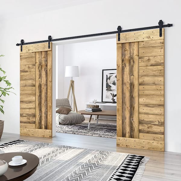 60 in. x 84 in. Weather Oak Stained DIY Knotty Pine Wood Interior Double Sliding Barn Door with Hardware Kit