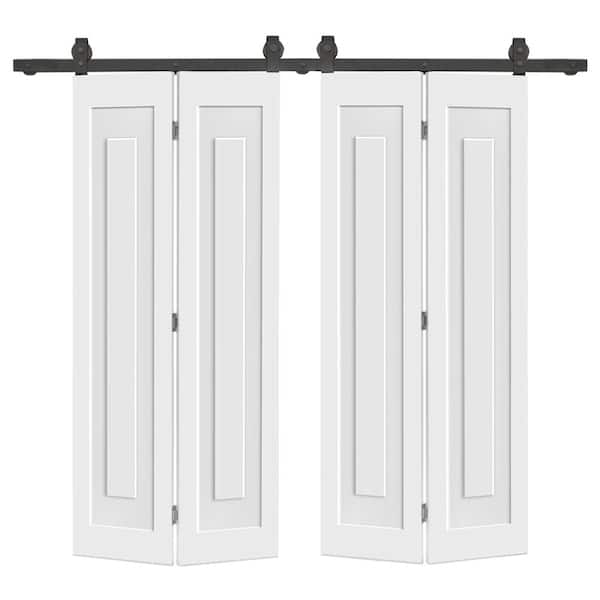 64 in. x 84 in. 1 Panel Shaker Hollow Core White Composite Double Bi-fold Door with Barn Door Hardware Kit