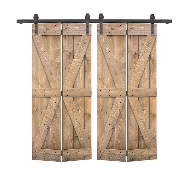 64 in. x 84 in. British K Pre-Assembled Solid Core Light Brown Wood Double Bi-fold Doors with Sliding Hardware Kit