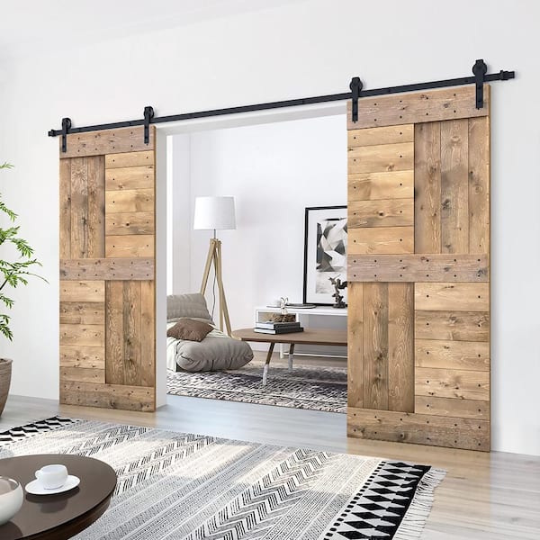 72 in. x 84 in. Light Brown Stained DIY Knotty Pine Wood Interior Double Sliding Barn Door with Hardware Kit
