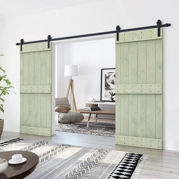 72 in. x 84 in. Mid-Bar Series Sage Green Stained Solid Pine Wood Interior Double Sliding Barn Door with Hardware Kit