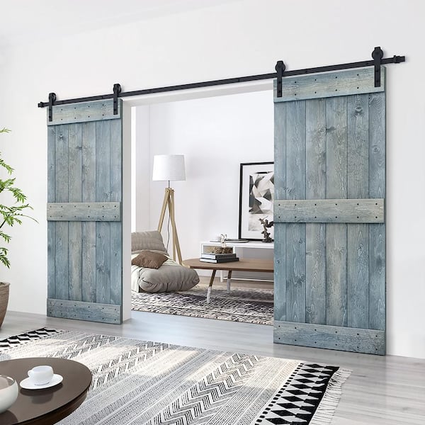 76 in. x 84 in. Mid-Bar Series Denim Blue Stained Solid Pine Wood Interior Double Sliding Barn Door with Hardware Kit