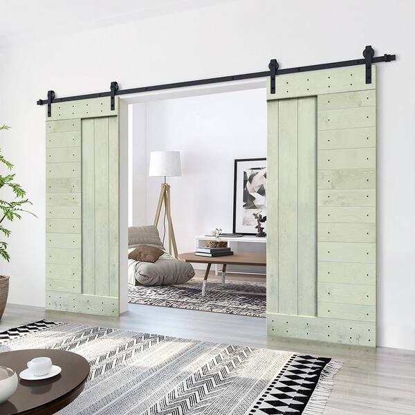 76 in. x 84 in. Sage Green Stained DIY Knotty Pine Wood Interior Double Sliding Barn Door with Hardware Kit