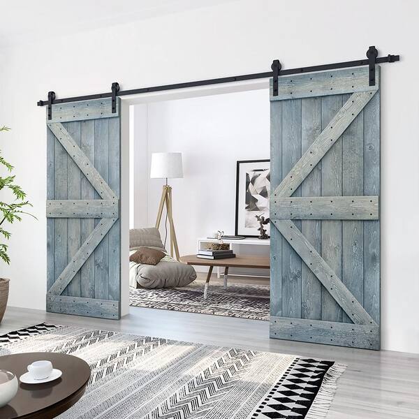84 in. x 84 in. K Series Denim Blue Stained Solid Knotty Pine Wood Interior Double Sliding Barn Door with Hardware Kit