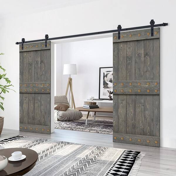 96 in. x 84 in. Weather Gray Stained DIY Pine Wood Interior Double Sliding Barn Door with Hardware Kit and Clavos
