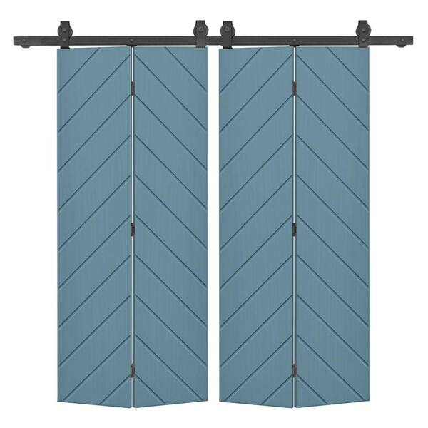 Herringbone 68 in. x 80 in. Dignity Blue Painted MDF Modern Bi-Fold Double Barn Door with Sliding Hardware Kit