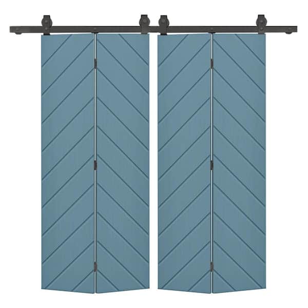 Herringbone 72 in. x 80 in. Dignity Blue Painted MDF Modern Bi-Fold Double Barn Door with Sliding Hardware Kit