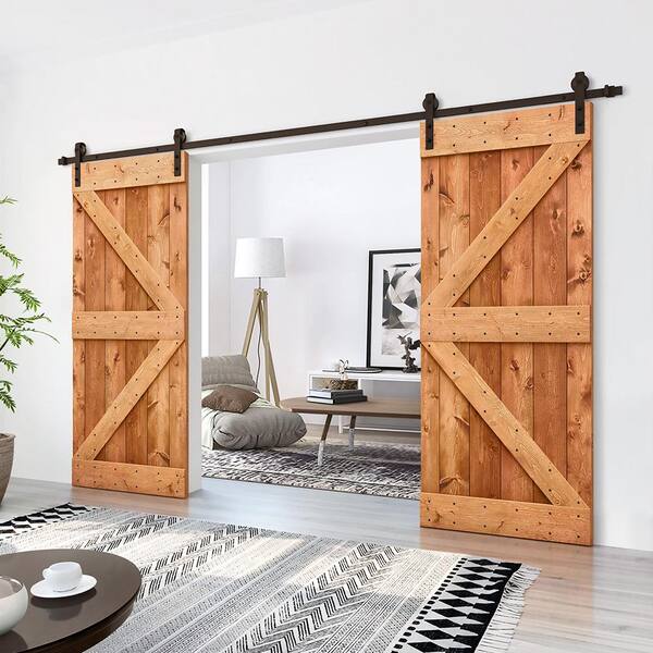 K 40 in. x 84 in. Red Walnut Stained DIY Solid Pine Wood Interior Double Sliding Barn Door with Hardware Kit