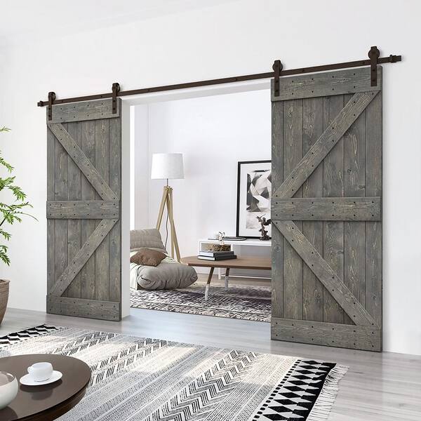 K 56 in. x 84 in. Weather Gray Stained DIY Solid Pine Wood Interior Double Sliding Barn Door with Hardware Kit