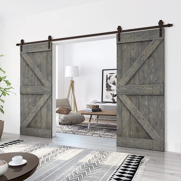 K 88 in. x 84 in. Weather Gray Stained DIY Solid Pine Wood Interior Double Sliding Barn Door with Hardware Kit