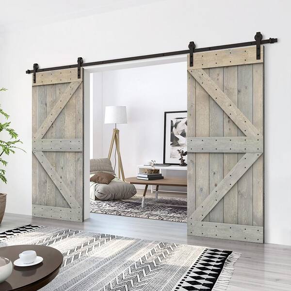 K 96 in. x 84 in. Smoke Gray Stained DIY Solid Pine Wood Interior Double Sliding Barn Door with Hardware Kit