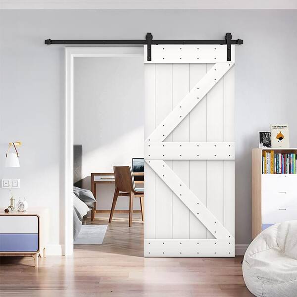 K Series 36 in. x 84 in. White DIY Knotty Pine Wood Interior Sliding Barn Door with Hardware Kit