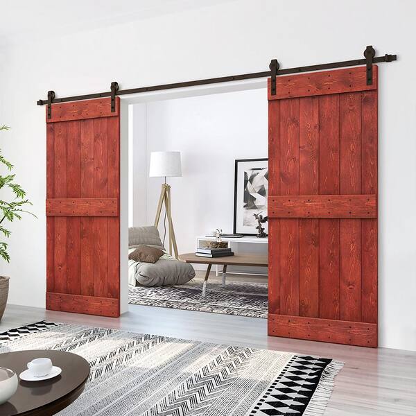 Mid-Bar 44 in. x 84 in. Cherry Red Stained DIY Solid Pine Wood Interior Double Sliding Barn Door with Hardware Kit