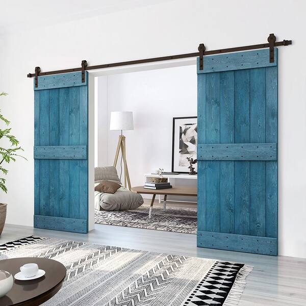 Mid-Bar 56 in. x 84 in. Ocean Blue Stained DIY Solid Pine Wood Interior Double Sliding Barn Door with Hardware Kit