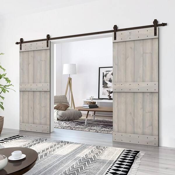 Mid-Bar 80 in. x 84 in. Silver Gray Stained DIY Solid Pine Wood Interior Double Sliding Barn Door with Hardware Kit