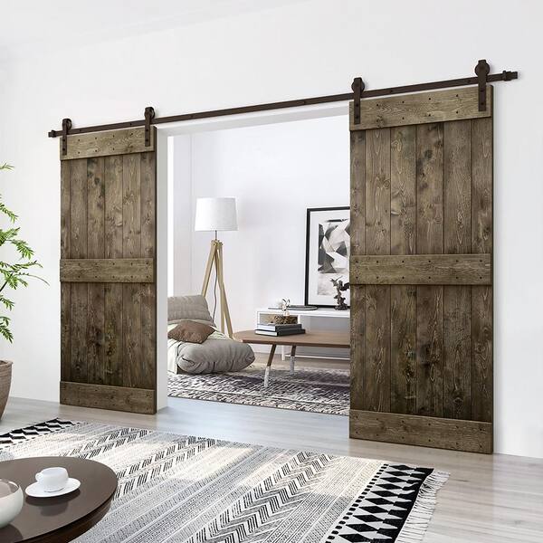 Mid-Bar 88 in. x 84 in. Espresso Stained DIY Solid Knotty Pine Wood Interior Double Sliding Barn Door with Hardware Kit