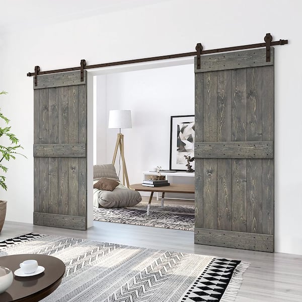Mid-Bar 88 in. x 84 in. Weather Gray Stained DIY Solid Pine Wood Interior Double Sliding Barn Door with Hardware Kit