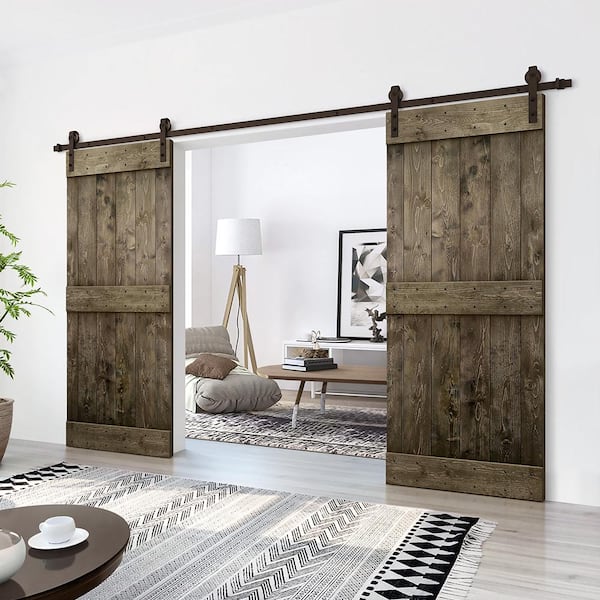 Mid-Bar 96 in. x 84 in. Espresso Stained DIY Solid Knotty Pine Wood Interior Double Sliding Barn Door with Hardware Kit
