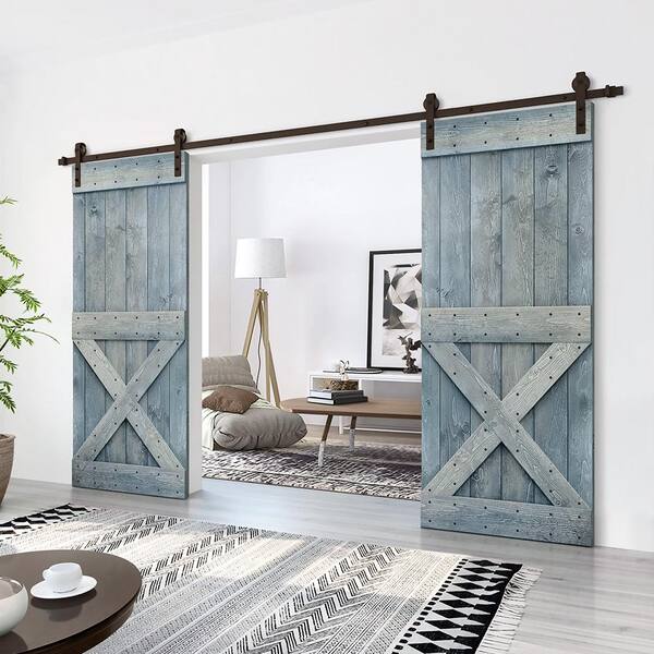 Mini X 48 in. x 84 in. Denim Blue Stained DIY Solid Pine Wood Interior Double Sliding Barn Door with Hardware Kit