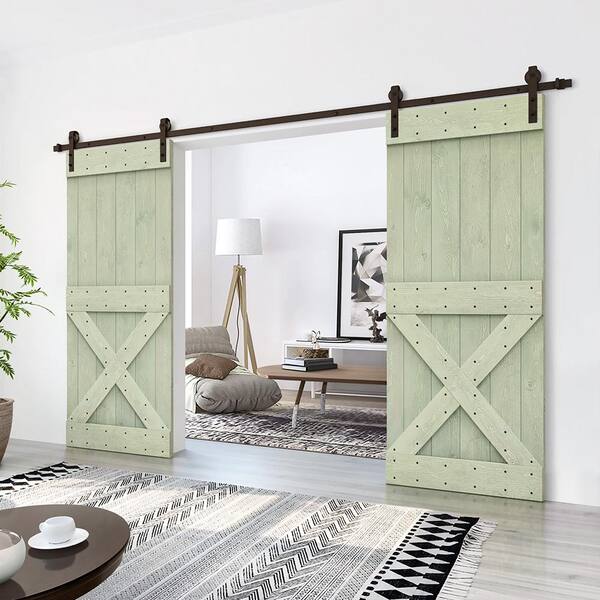 Mini X 60 in. x 84 in. Sage Green Stained DIY Solid Pine Wood Interior Double Sliding Barn Door with Hardware Kit