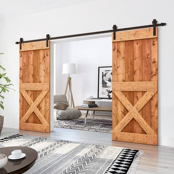 Mini X 68 in. x 84 in. Red Walnut Stained DIY Solid Pine Wood Interior Double Sliding Barn Door with Hardware Kit
