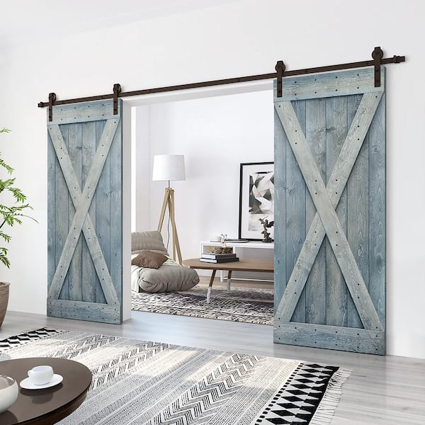 X 48 in. x 84 in. Denim Blue Stained DIY Solid Pine Wood Interior Double Sliding Barn Door with Hardware Kit