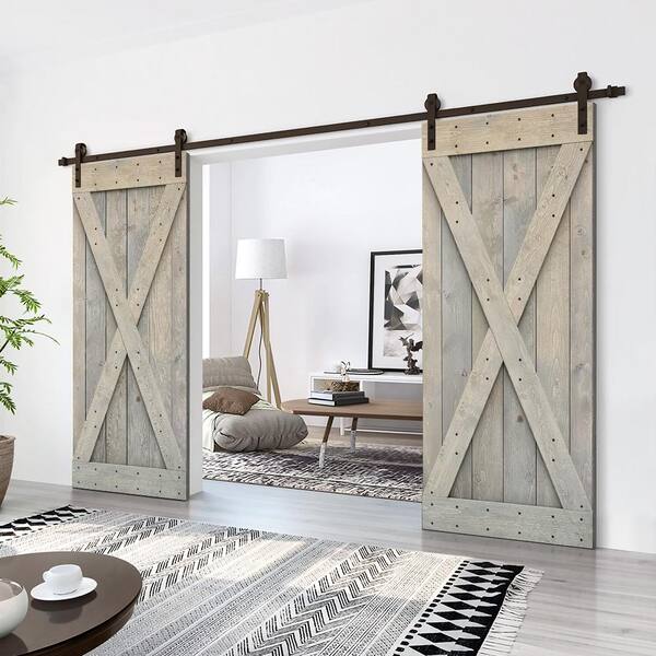 X 56 in. x 84 in. Smoke Gray Stained DIY Solid Pine Wood Interior Double Sliding Barn Door with Hardware Kit