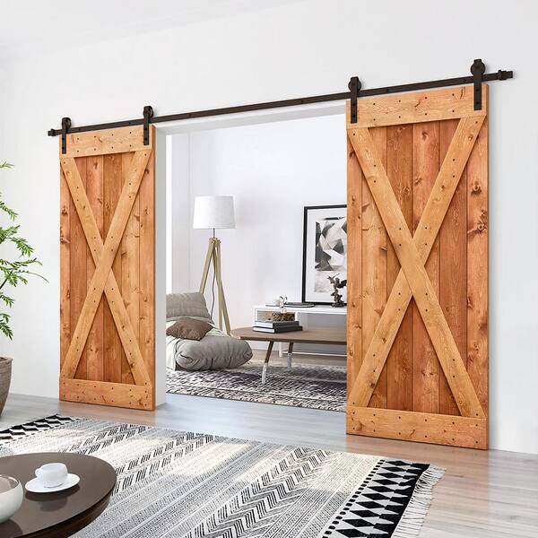 X 60 in. x 84 in. Red Walnut Stained DIY Solid Pine Wood Interior Double Sliding Barn Door with Hardware Kit